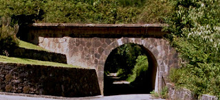 Foto tomada de Internet sin fecha, anterior a la horrible solución de montar el tablero metálico oxidado a modo de pasarela y reforzar el estribo contrario con encofrados de hormigón a la vista, sin revestir con un poquito de mampuestos, al menor. Se trata de los restos de un puente neoclásico aunque con elementos muy rústicos y económicos, destacando especialmente el buen trabajo de cantería en boquillas.